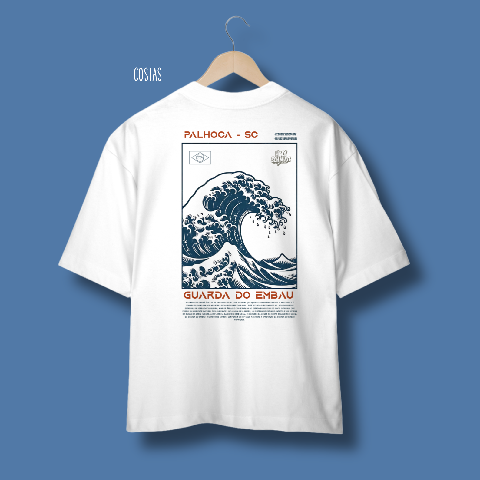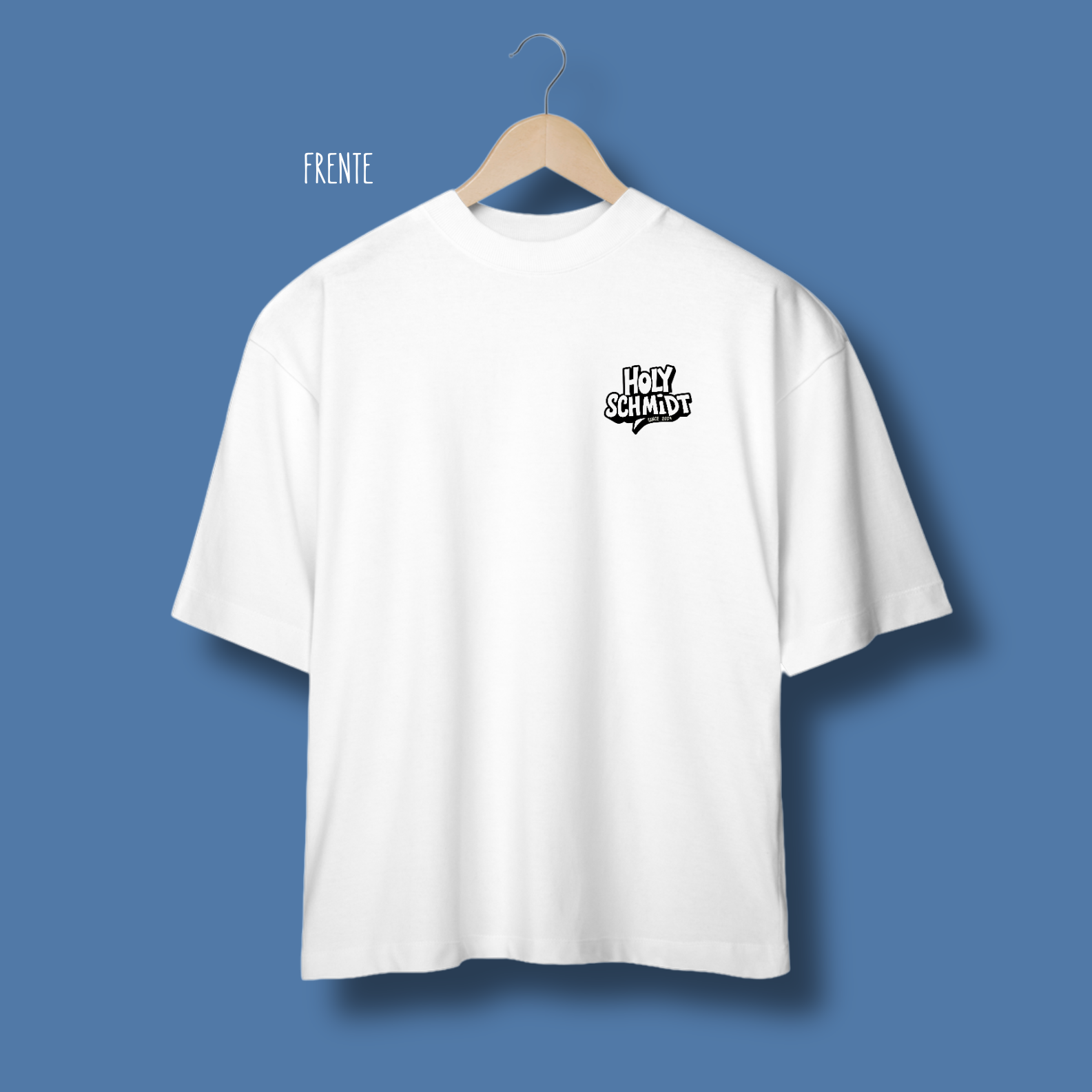 Oversized com estampa frente e costas, sendo na frente a logo da empresa pequena e nas costas a arte gráfica.